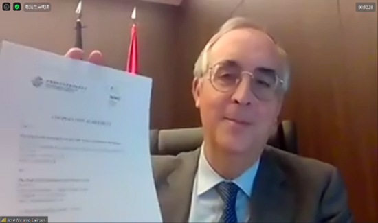 2021年7月8日,中國(guó)國(guó)際經(jīng)濟(jì)貿(mào)易仲裁委員會(huì)(CIETAC)與西班牙馬德里國(guó)際仲裁中心(MIAC)通過線上方式舉行了《合作協(xié)議》簽署儀式。貿(mào)仲副主任兼秘書長(zhǎng)王承杰先生與馬德里國(guó)際仲裁中心主席José Antonio Caínzos先生分別代表雙方在《合作協(xié)議》上簽字。馬德里國(guó)際仲裁中心秘書長(zhǎng)及馬德里律師協(xié)會(huì)國(guó)際關(guān)系負(fù)責(zé)人一同出席了本次儀式。
