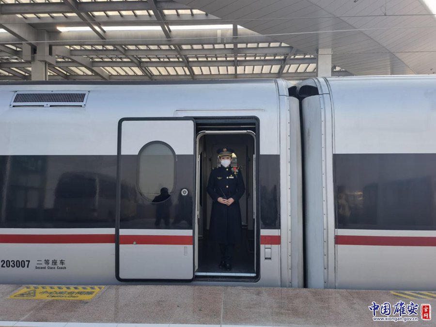12月27日,乘務(wù)員在雄安開(kāi)往北京西的C2702次列車旁迎接旅客上車。劉東堯 攝