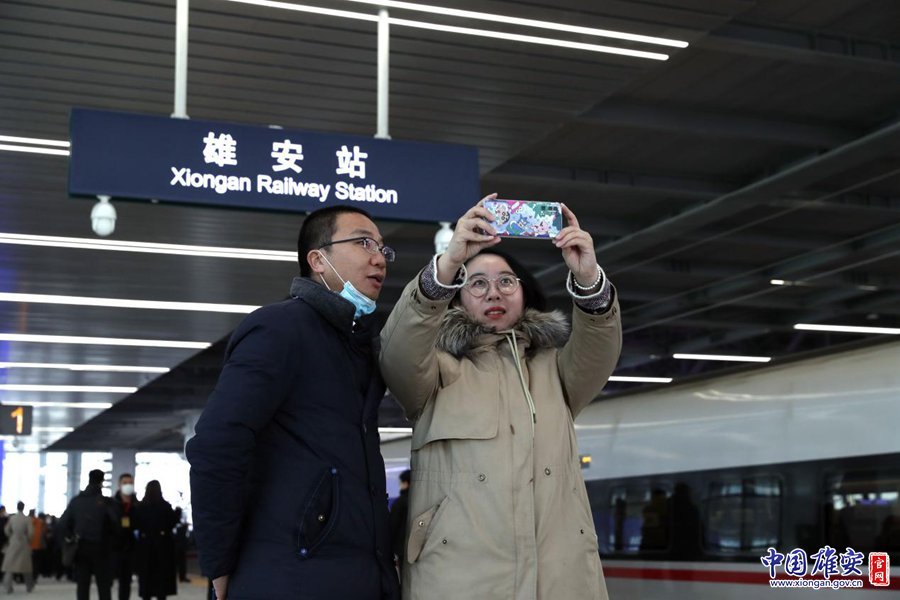 12月27日,在雄安站,乘坐C2702次列車的旅客在列車前拍照留念。劉東堯 攝
