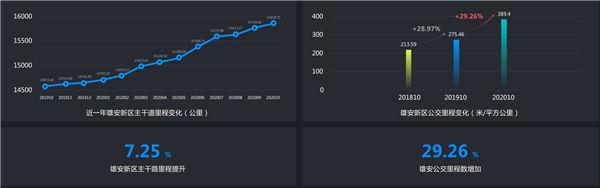 雄安對外骨干路網(wǎng)也進(jìn)入了實質(zhì)性建設(shè)階段,路網(wǎng)密度整體上升。2020 年10月,雄安主干路網(wǎng)里程對比2019年10月提升了7.25%。衛(wèi)星遙感影像顯示,榮烏高速和京雄高速以“南北縱橫”的形態(tài)清晰呈現(xiàn),雄安新區(qū)的主干路網(wǎng)也已呈現(xiàn)出初步輪廓,京雄城際鐵路已經(jīng)全線貫通。此外,雄安的公交系統(tǒng)逐步完善,2020年的公交里程較2019年同期增加了29.26%。