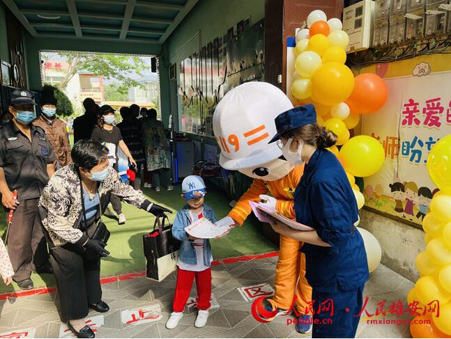 消防隊員給入園的小朋友和家長發(fā)放宣傳資料。趙淑晴/攝
