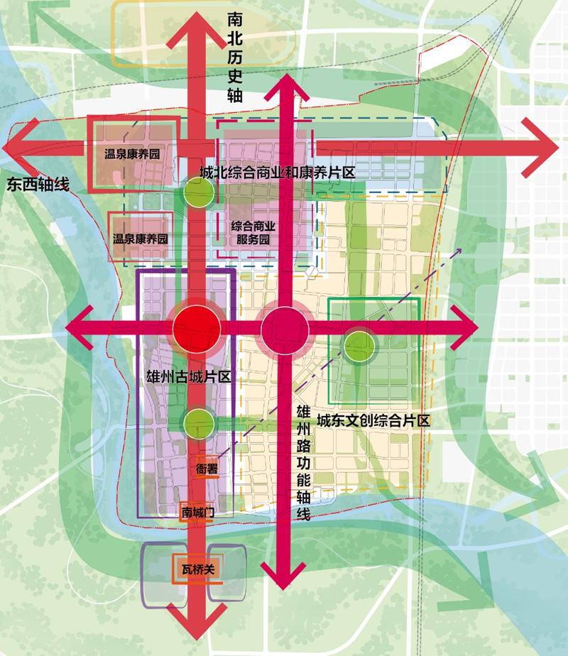 “池面綠陰通易水,樓頭青靄見狼山,漁舟掩映江南浦,使驛差池古北關(guān)”。雄縣組團(tuán)縣城片區(qū)在白溝引河、大清河、新蓋房分洪道三條水脈的拱衛(wèi)下,仿若一朵秀美荷花,緩緩綻放。規(guī)劃方案遵循其良好的生態(tài)本底與景觀特色,同時(shí)溯源雄縣延續(xù)千年的古城形制和歷史街巷格局,整體形成“一水彎環(huán)、雙軸交匯、一城兩片”的空間布局結(jié)構(gòu)。大清河依城而過,南北歷史軸和新區(qū)東西軸交匯于縣城,雄州路和文昌大街交匯形成內(nèi)部功能發(fā)展軸,依托城、關(guān)、河等歷史要素,恢復(fù)雄州古城歷史格局,發(fā)展城東文創(chuàng)綜合片區(qū)、城北綜合商業(yè)和康養(yǎng)片區(qū)。