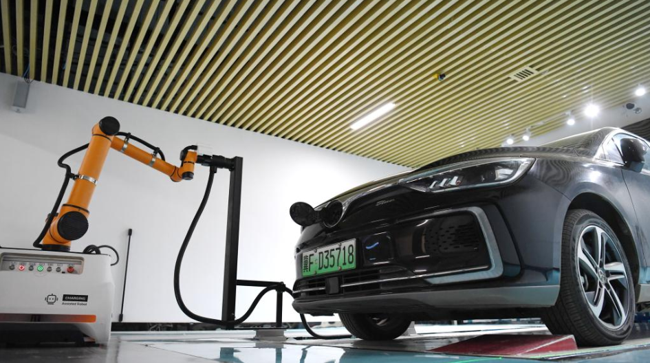 在劇村站智慧充電區(qū),插拔槍機(jī)器人對(duì)一輛電動(dòng)汽車進(jìn)行充電。(新華社記者朱旭東 攝)