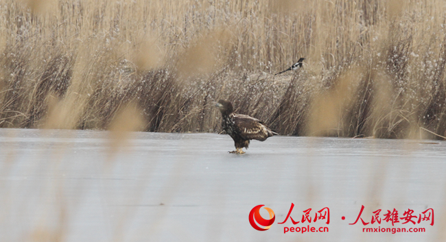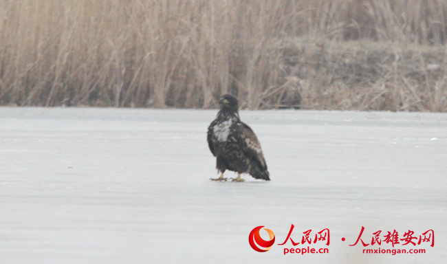 在白洋淀發(fā)現(xiàn)的白尾海雕(冰面上)。田曾睿攝