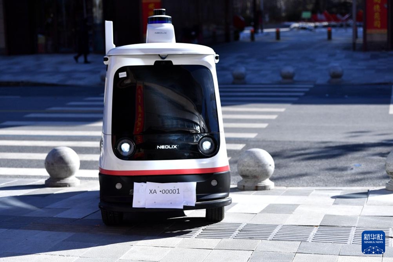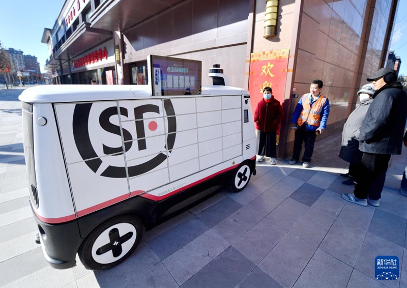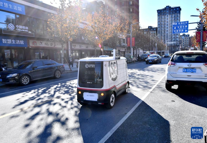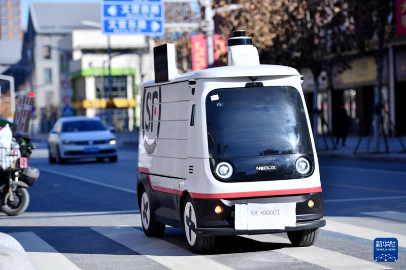 1月22日,無(wú)人駕駛配送車(chē)在派送郵件。新華社記者王曉 攝