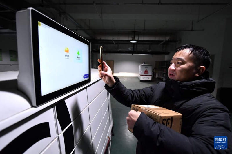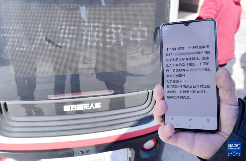 1月22日,居民收取無(wú)人駕駛配送車(chē)送來(lái)的郵件。新華社記者 王曉 攝