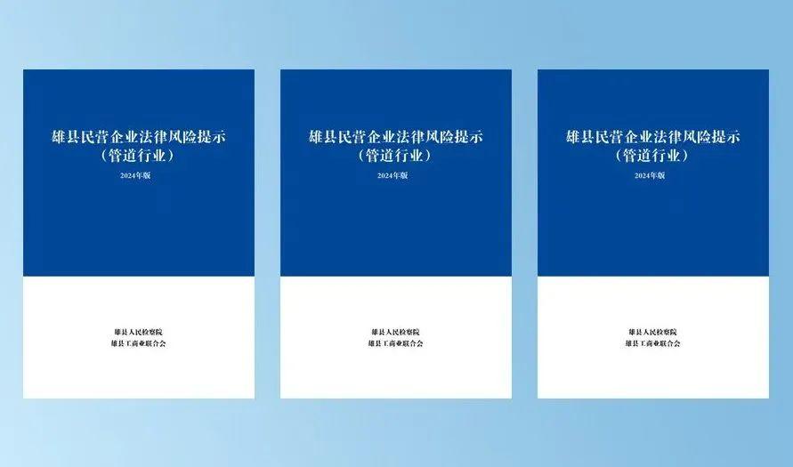 1月10日,雄縣管道行業(yè)協(xié)會2025年年會召開。會上,雄縣人民檢察院會同雄縣工商業(yè)聯(lián)合會正式發(fā)布《雄縣民營企業(yè)法律風險提示(管道行業(yè))2024版》(以下簡稱《提示》)。