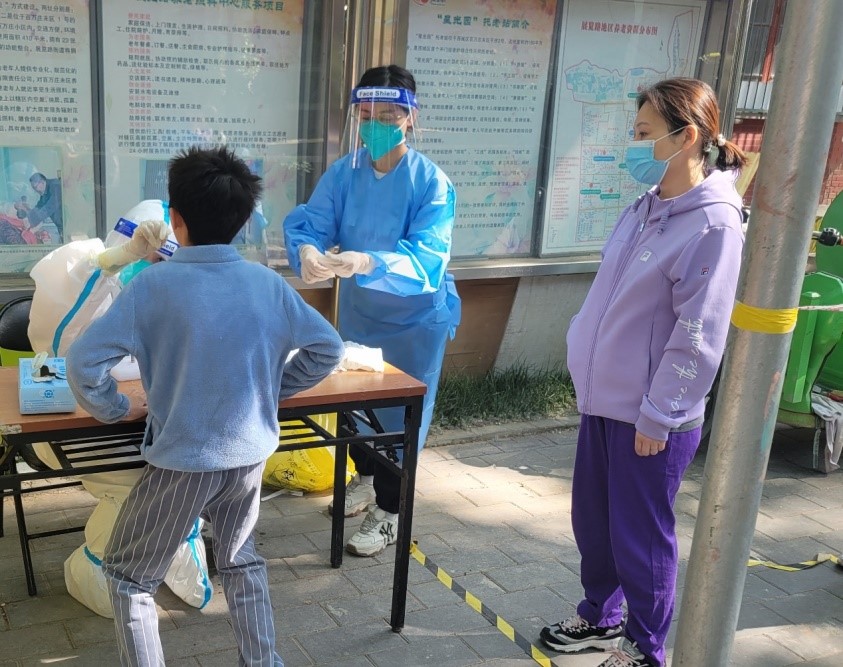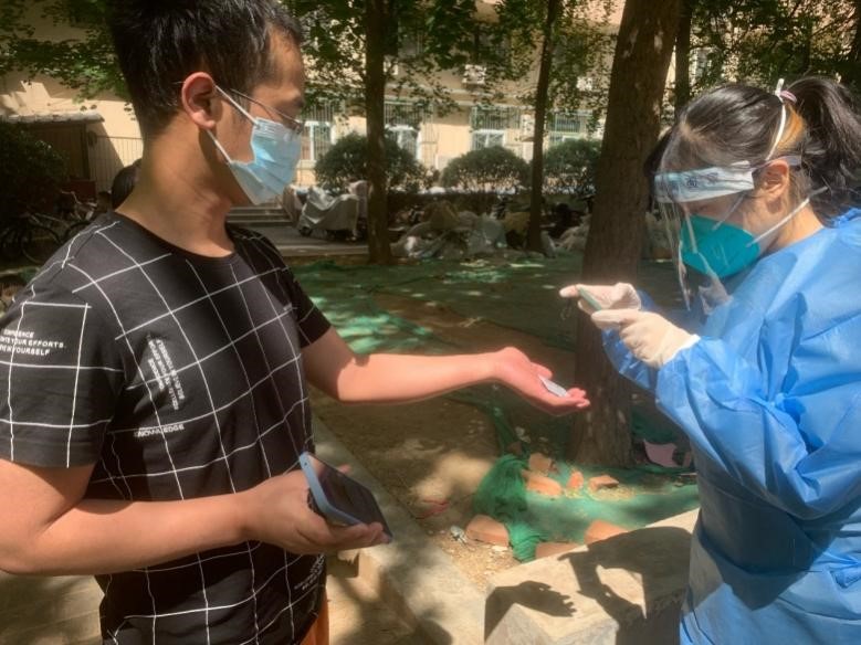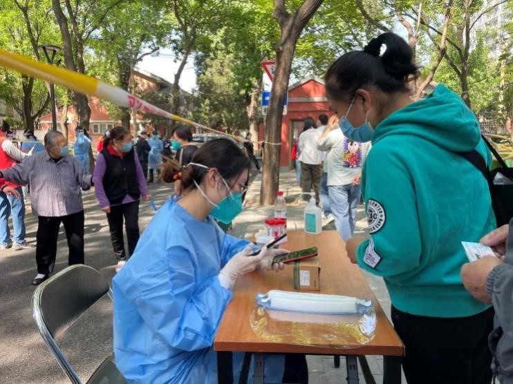 5月3日早6點(diǎn),我和院里一行18名志愿者已在百萬莊社區(qū)集結(jié)就位了。登記身份信息、引導(dǎo)排隊(duì)秩序、解答群眾疑問……對(duì)于這些流程,志愿者們都已經(jīng)非常熟練,我和小伙伴們默契地迅速就位,投入了工作。今天,為了提高檢測效率,我領(lǐng)到了“高級(jí)任務(wù)”:協(xié)助醫(yī)生開展采樣。