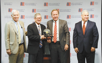 圖為6月12日,尼爾·布什(左三)在亞特蘭大為美國(guó)前總統(tǒng)卡特頒發(fā)首屆美中關(guān)系卓越領(lǐng)袖獎(jiǎng),其子詹姆斯·卡特(左二)代為領(lǐng)獎(jiǎng)。