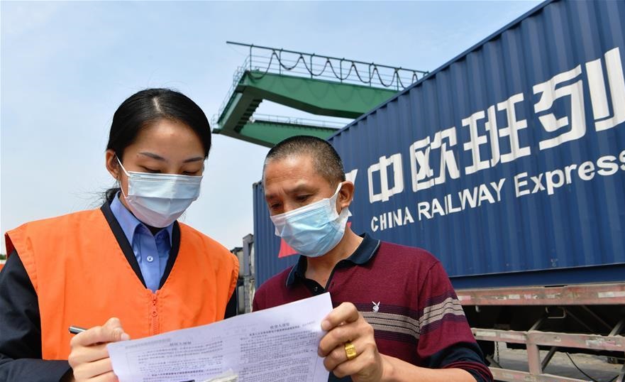 4月25日,中國(guó)鐵路南昌局集團(tuán)有限公司海滄站貨運(yùn)員李瑩(左)在廈門海滄站和發(fā)貨方代表辦理中歐班列貨物進(jìn)站交接手續(xù)。 當(dāng)日,中歐班列X8098次貨物列車從福建廈門海滄站出發(fā),開(kāi)往德國(guó)漢堡。這趟中歐班列搭載50個(gè)40尺標(biāo)準(zhǔn)集裝箱,裝有一次性防疫口罩、簡(jiǎn)易呼吸器、輸液器、防護(hù)服等約468萬(wàn)件防疫物資,以及服裝、電子產(chǎn)品等貨物。 據(jù)中國(guó)鐵路南昌局集團(tuán)有限公司數(shù)據(jù)統(tǒng)計(jì),2020年第一季度,漳州車務(wù)段海滄站已累計(jì)開(kāi)行中歐班列66列,裝車3014輛,貨物價(jià)值約2億美元;與2019年同期相比,開(kāi)行列數(shù)增長(zhǎng)88%,裝運(yùn)量增長(zhǎng)196%,運(yùn)輸收入增長(zhǎng)219%。 新華社記者 魏培全 攝