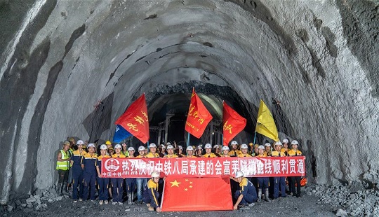 7月23日,中國中鐵八局員工在老撾北部烏多姆賽省貫通會富萊隧道后合影。 中老鐵路全線控制性工程——會富萊隧道23日貫通,為后續(xù)架梁鋪軌施工、實現2021年全線通車目標創(chuàng)造條件。 新華社發(fā)(中鐵八局供圖)