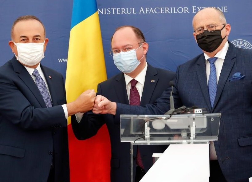 4月23日,在羅馬尼亞首都布加勒斯特,羅馬尼亞外長(zhǎng)奧雷斯庫(kù)(中)、波蘭外長(zhǎng)拉烏(右)和土耳其外長(zhǎng)恰武什奧盧在聯(lián)合記者會(huì)上碰拳。
