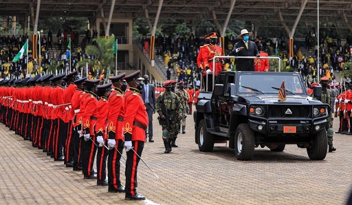 5月12日,穆塞韋尼(右前)在烏干達(dá)坎帕拉出席總統(tǒng)就職典禮時(shí)檢閱儀仗隊(duì)。