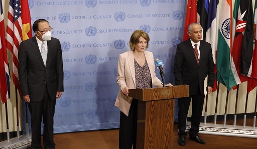 5月16日,在位于紐約的聯(lián)合國總部,中國常駐聯(lián)合國代表張軍(左)同挪威常駐聯(lián)合國代表莫娜·尤爾(中)、突尼斯常駐聯(lián)合國代表拉德布共同會見記者。新華社記者 謝鍔 攝