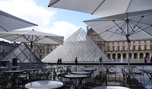 5月19日,法國(guó)巴黎盧浮宮博物館旁的餐館戶(hù)外區(qū)域準(zhǔn)備迎客。新華社記者高靜攝