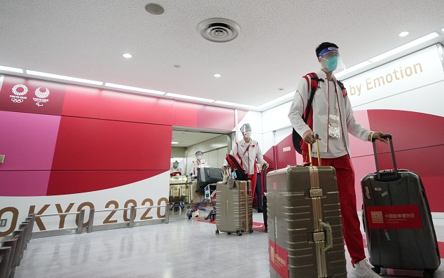 當(dāng)日,參加?xùn)|京奧運會的中國體育代表團部分成員抵達東京。