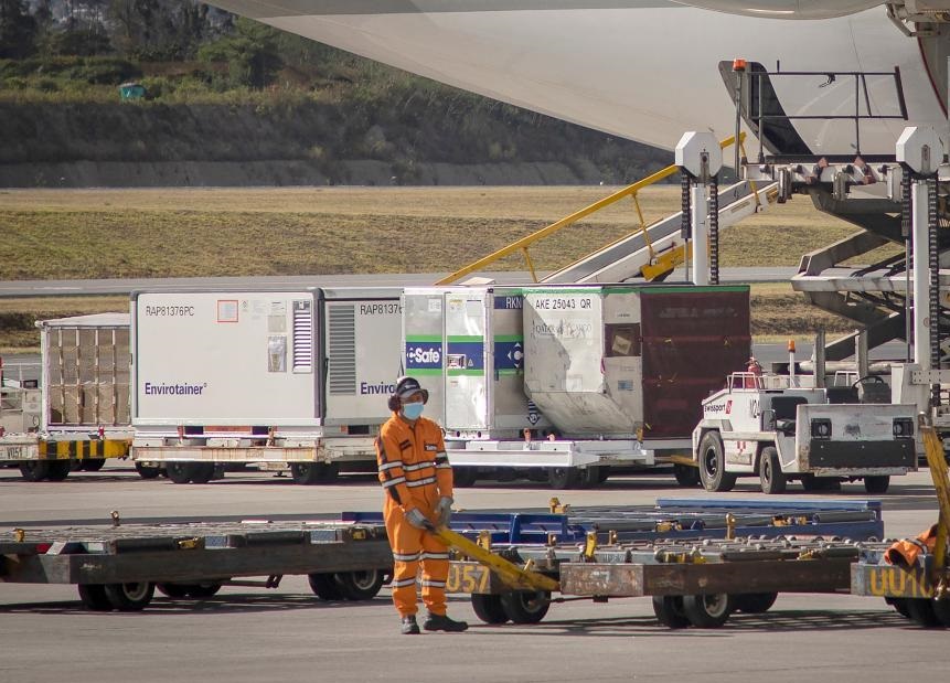 8月3日,工作人員在厄瓜多爾首都基多蘇克雷國(guó)際機(jī)場(chǎng)轉(zhuǎn)運(yùn)新冠疫苗。