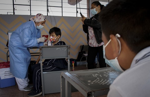 10月18日,醫(yī)務(wù)人員在厄瓜多爾首都基多一所學(xué)校為學(xué)生接種疫苗。