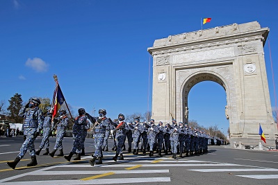 12月1日,士兵在羅馬尼亞首都布加勒斯特凱旋門參加閱兵式。