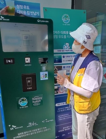 一般游客在進入牛島前,可以在碼頭等處掃碼,簽署支持牛島資源循環(huán)運動的聲明。游客用完島上餐飲商鋪提供的可重復使用塑料杯后,可將其放入回收設備,回收后的杯子經過清洗、消毒等流程后將被重復利用。為鼓勵游客積極參與,回收終端提供積分、現(xiàn)金返還和交通卡充值等形式的獎勵。此外,對于沒有用完的塑料杯,游客可以帶出牛島,在濟州島主要交通設施、指定咖啡店等處利用回收設備進行回收。