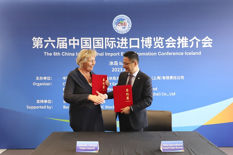 16日,在冰島雷克雅未克,冰中貿(mào)促會(huì)主席約尼娜·比亞特馬斯與中國國際進(jìn)口博覽局簽署合作備忘錄。新華社記者 陳靜 攝