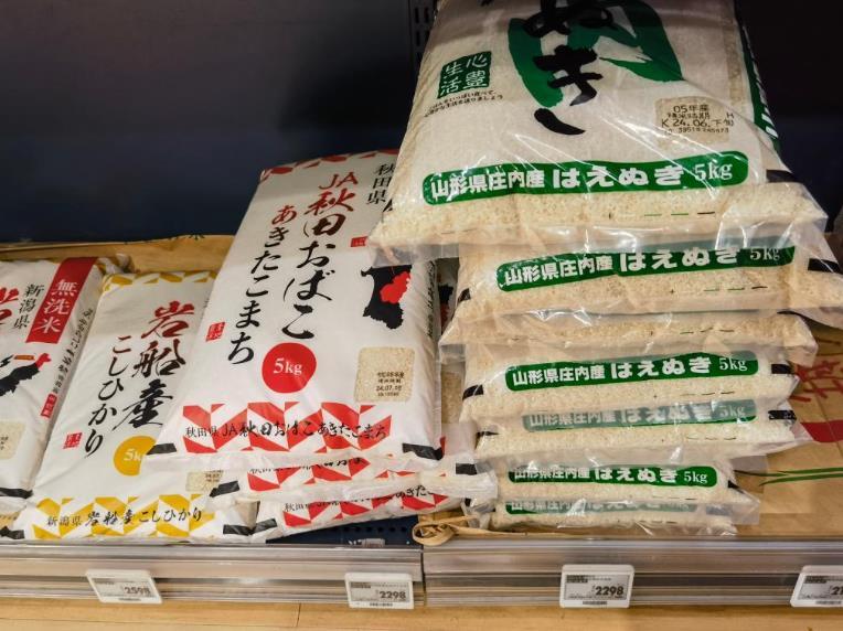 這是2024年7月26日在日本東京一家連鎖超市拍攝的貨架上的大米(手機照片)。新華社記者鐘雅攝