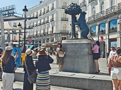 今年夏季,大批中國(guó)游客到訪西班牙馬德里。圖為近日,中國(guó)游客與馬德里標(biāo)志性雕塑——熊與樹(shù)莓合影。人民日?qǐng)?bào)記者 許海林?jǐn)z