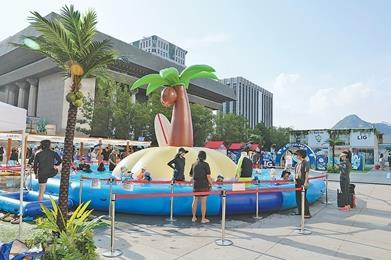 家長和孩子們在“2025首爾夏季海灘”活動(dòng)現(xiàn)場的小型游泳池里消暑。人民日報(bào)記者 莽九晨攝