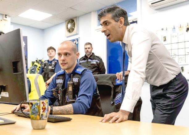 當?shù)貢r間2024年4月10日,英國蘇塞克斯郡,時任英國首相蘇納克在霍舍姆警察局觀看監(jiān)控錄像,表示政府將遏制商店盜竊犯罪。 CFP供圖