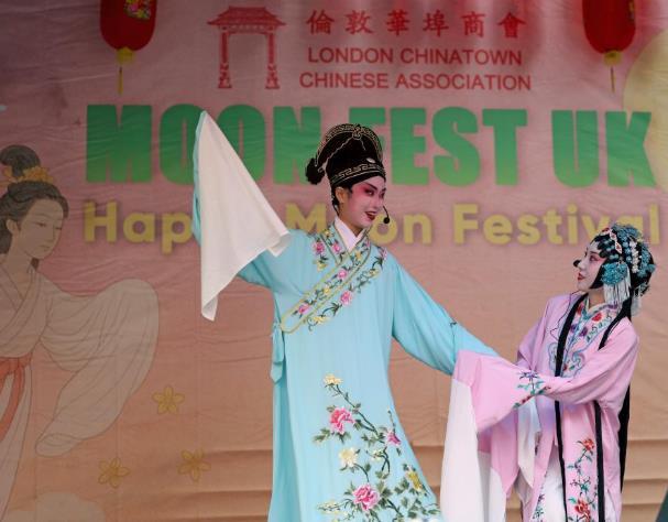10月5日,演員在英國倫敦舉行的中秋節(jié)慶祝活動(dòng)上表演戲曲。新華社記者 李穎 攝