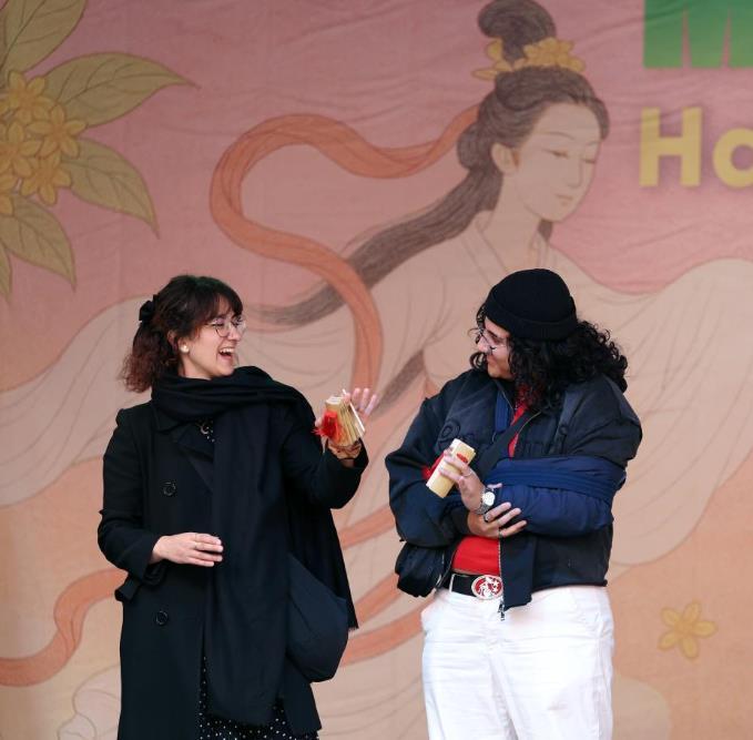 10月5日,當(dāng)?shù)孛癖娫谟鴤惗嘏e行的中秋節(jié)慶?;顒?dòng)上體驗(yàn)打快板。新華社記者 李穎 攝