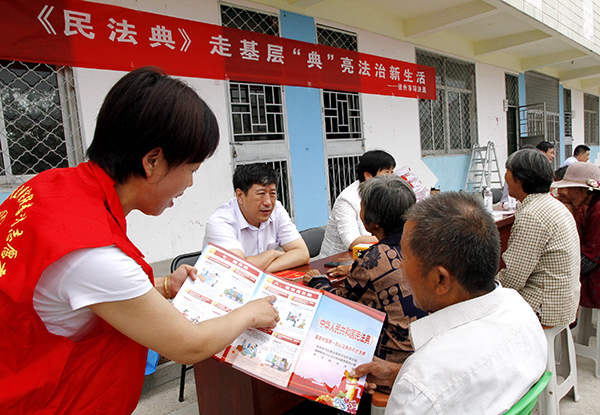 圖為律師和志愿者正在向村民們宣講民法典相關(guān)內(nèi)容。