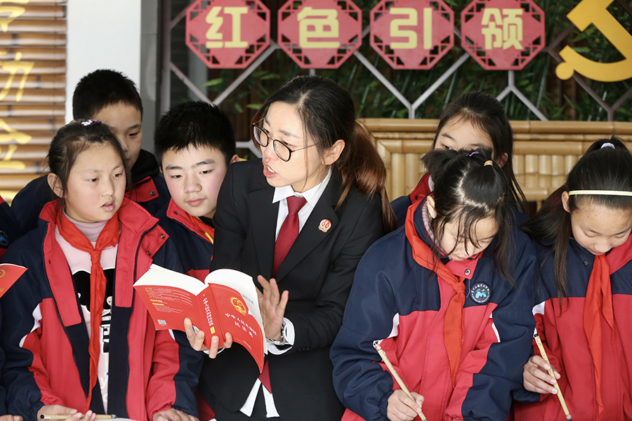 村巷法官徐銀銀走進浙江省德清縣莫干山中心學校,書寫民法典,放飛法治夢。