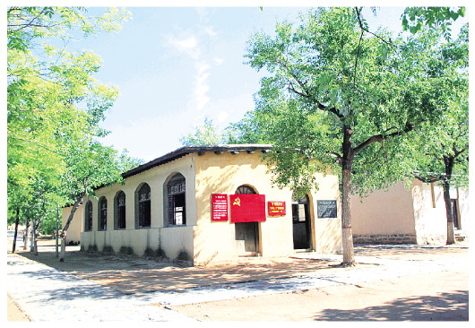 走進(jìn)會場,只見正面掛著一塊絳紫色的幕布,幕布上懸掛兩面繡有“中國共產(chǎn)黨”字樣的黨旗,黨旗上方是毛澤東和朱德的兩幅畫像,會場兩側(cè)的白墻上懸掛著四面黨旗。