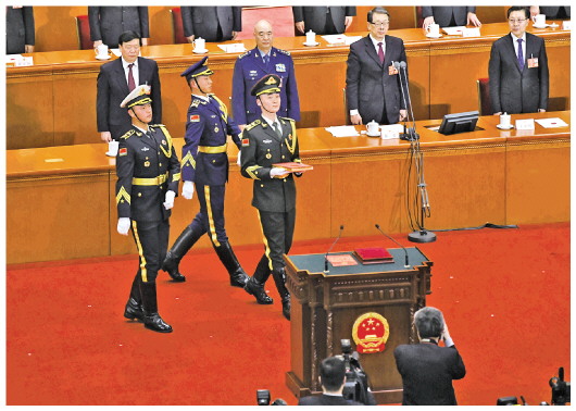2018年3月17日,十三屆全國人大一次會(huì)議憲法宣誓儀式在北京人民大會(huì)堂舉行。主席臺(tái)上,3名禮兵邁著正步護(hù)送《中華人民共和國憲法》入場。 居楊 攝
