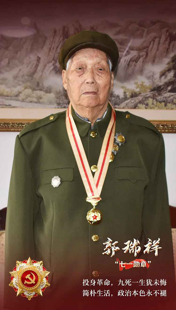 中國共產(chǎn)黨百年光輝歷程,郭瑞祥既是見證者又是參與者。作為軍人,他先后榮立二等功1次、三等功2次,1957年被授予三級(jí)獨(dú)立自由勛章、三級(jí)解放獎(jiǎng)?wù)?1988年被授予中國人民解放軍獨(dú)立功勛榮譽(yù)章。