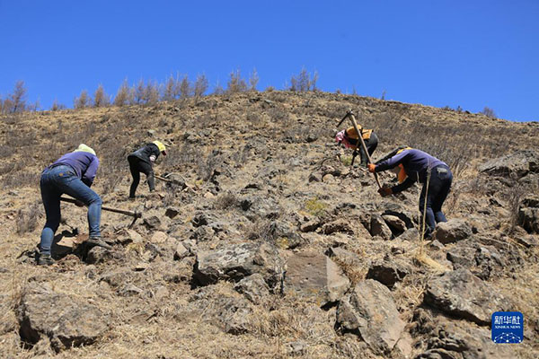 塞罕壩機(jī)械林場工人在石質(zhì)陽坡上造林(2016年4月13日攝)。新華社發(fā)