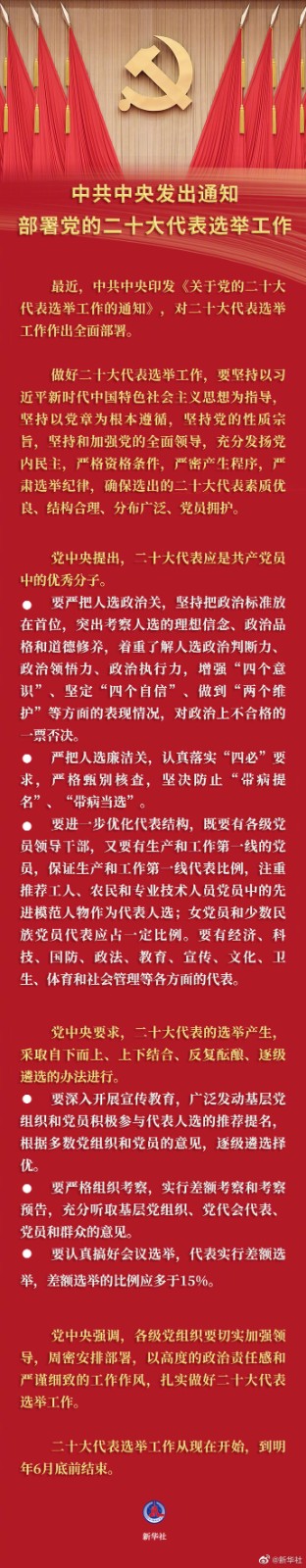黨中央強調(diào),各級黨組織要切實加強領(lǐng)導,周密安排部署,以高度的政治責任感和嚴謹細致的工作作風,扎實做好二十大代表選舉工作。要嚴肅政治紀律、組織紀律和選舉紀律,充分運用湖南衡陽、四川南充、遼寧等地拉票賄選、破壞選舉案件,開展警示教育,汲取教訓,引以為戒。加強對代表選舉工作的全程監(jiān)督,對違規(guī)違紀違法問題“零容忍”,一經(jīng)發(fā)現(xiàn)堅決查處,確保風清氣正。要通過做好學習宣傳、組織動員、推薦提名、會議選舉、嚴肅紀律等各項工作,使代表選舉產(chǎn)生過程成為深入學習貫徹習近平新時代中國特色社會主義思想的過程,成為貫徹落實新時代黨的建設(shè)總要求和新時代黨的組織路線的過程,成為理想信念教育和黨性黨風黨紀黨史教育的過程,成為黨內(nèi)政治生活生動實踐和民主集中制教育的過程,進一步增強黨的創(chuàng)造力、凝聚力、戰(zhàn)斗力,動員廣大黨員、干部更加緊密地團結(jié)在以習近平同志為核心的黨中央周圍,不忘初心、牢記使命,攻堅克難、開拓奮進,為全面建設(shè)社會主義現(xiàn)代化國家、奪取新時代中國特色社會主義偉大勝利、實現(xiàn)中華民族偉大復興的中國夢作出新的更大貢獻。