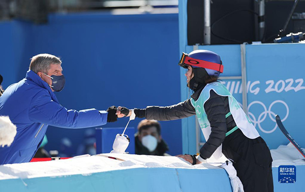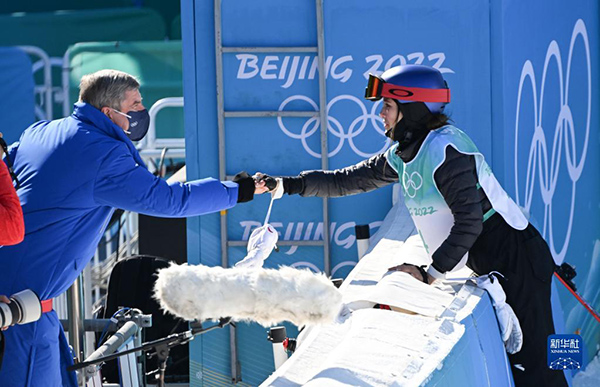 2月8日,國際奧委會(huì)主席巴赫(左)向中國選手谷愛凌表達(dá)祝賀。