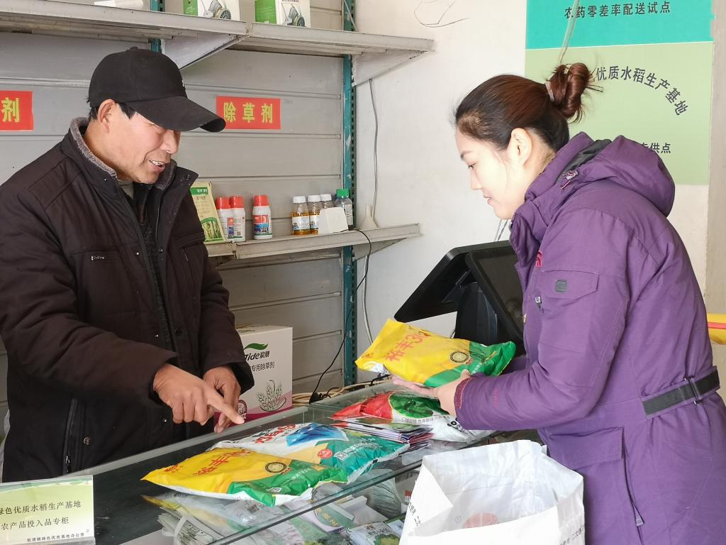 權(quán)太琦(右)在農(nóng)資銷售店詢問價(jià)格變化。 新華社記者 陸華東 攝