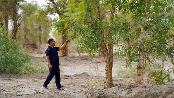 6月20日,艾力·尼亞孜在塔里木河支流查看胡楊生長(zhǎng)情況。
