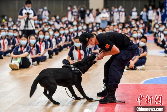 學(xué)生們與展示完搜索毒品技能的緝毒犬親密互動。 劉新 攝